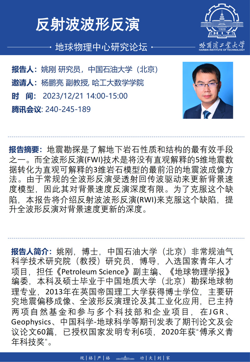 中国石油大学(北京)姚刚研究员关于反射波形反演的学术报告